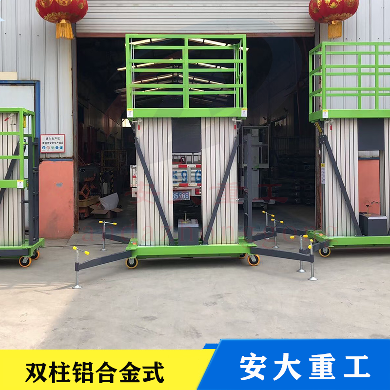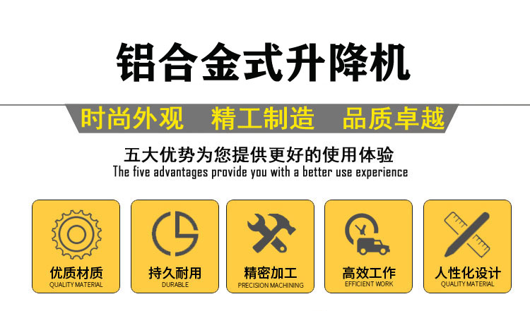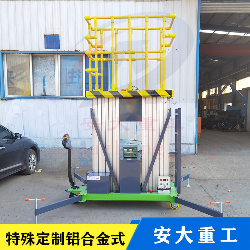 鋁合金式升降平臺(tái)采用高強(qiáng)度優(yōu)質(zhì)鋁合金材料,具有造型美觀,體積小,重量輕,升降平穩(wěn),安全可靠等優(yōu)點(diǎn)。